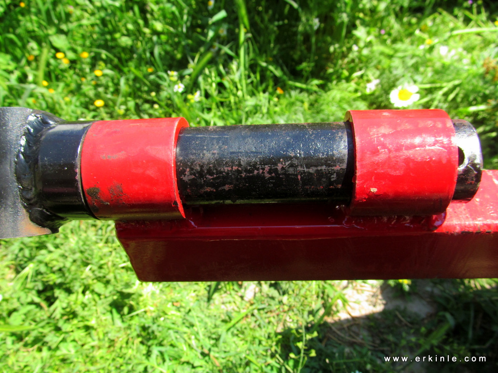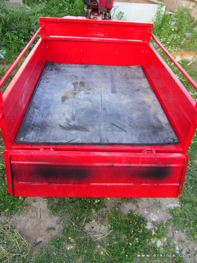 Bir şeyler koyup taşıması rahat olsun diye makaslı modelinden almıştım, dediklerine göre bu modeller 500 kg yük rahat çekebilirmiş. Ama arkasına bişeyler koyarken tabandaki sac zedelenmesin diye Didim’de hurdacıları dolaşıp taşıyıcı bant lastiği aradım. Metresine 30.-TL diyen çıktıysa da ben 3 metresine 50.-TL pazarlık ettim. zaten 120 cm işimi görüyordu ve kalan da yedek olur diye düşündüm.