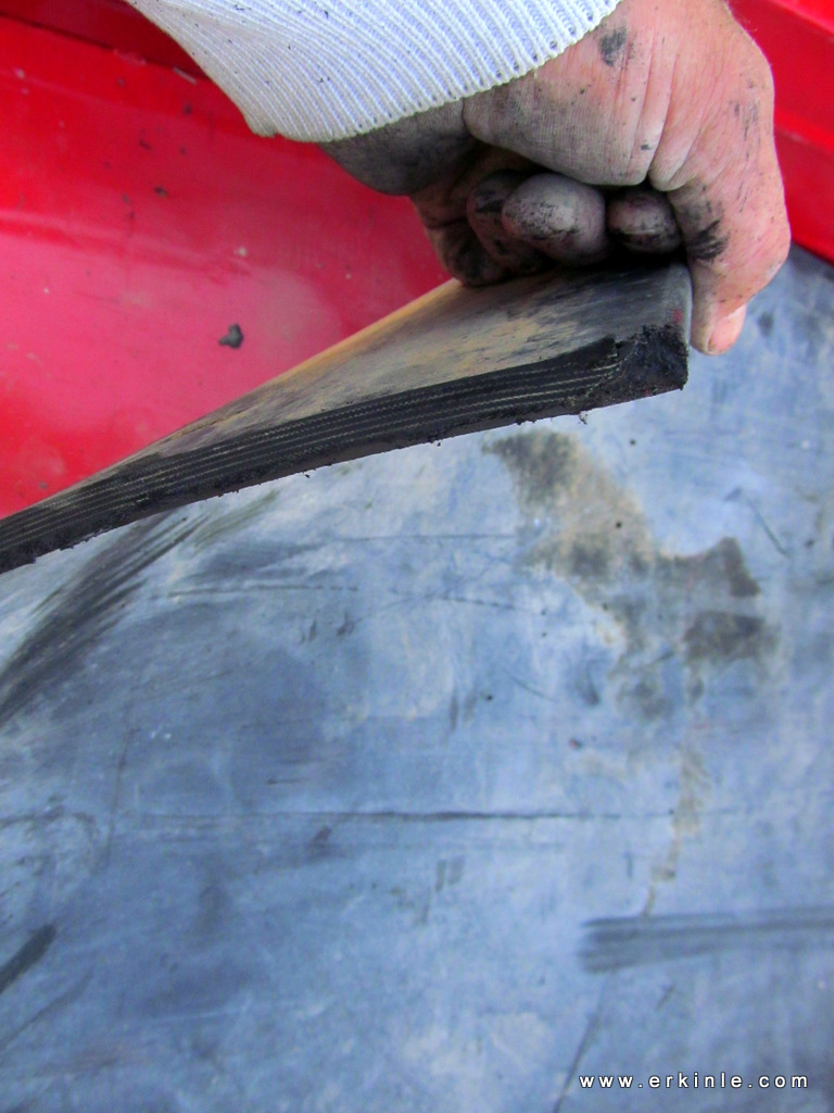 Bu lastiği keserken çok zorlandım. Hurdacıyla o kadar pazarlık yapınca “kesme işine karışmam” dedi ve verdiği bıçakla debelendim durdum. Eve geldikten sonra romorkun tabanı ölçüsünde işaretleyip küçük bir el spiraliyle kestim kesmesine ama her yanım lastik kırıntısı doldu…