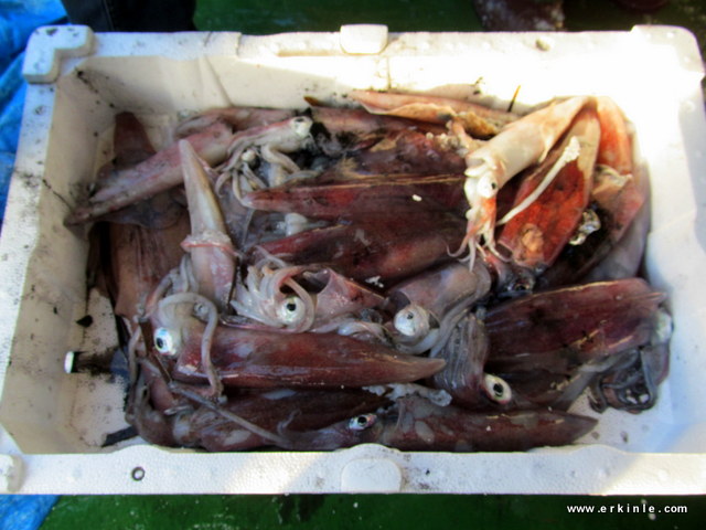 - lamba kayığına toplaşan kalamarlar kemen tartılıp buzlanıyor