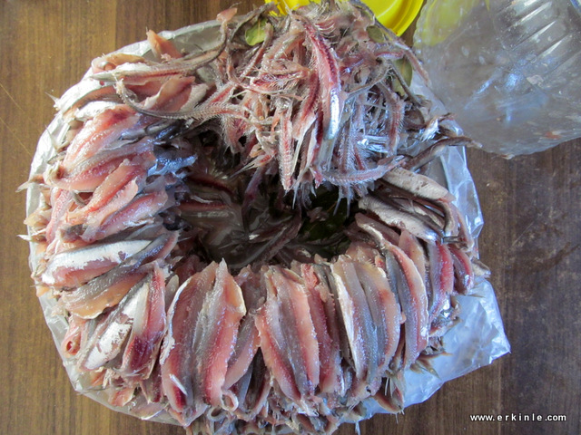 hamsileri bu kez çıkartıp bastırarak ortasındaki kılçığını alıyoruz. Bu tuzda gecen zaman içerisinde balık tuzda pişmeye başladığından bu kılçık çıkartma işi kolay oluyor.