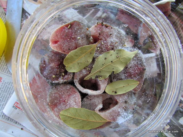 Daha sonra bir gazete veya kağıt havlu üzerine alınan balık parçaları iyice kurutuluyor. Kuruyan suyu süzülen balık parçaları lakerda kuracağımız tercihen cam kabın içine serdiğimiz bir parmak kalınlığındaki tuzun üzerine kesik yerleri tuza değecek şekilde yerleştirilmeye başlanıyor. ilk kat ve tuz ve defne yaprağı ve isteğe göre tane karabiber ve tuz ve balık… şeklinde devam ediyoruz. en üste yine tuz ve bütün balığı bastıracak kadar bir tahta veya taş parçası konulutor. 3-5 gün sonra kavanozun altına suyu birikiyor, bunu atıyoruz.
